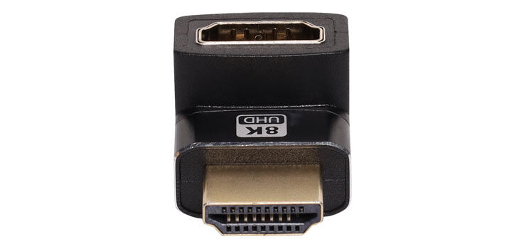 Right Angle 8K HDMI Adaptor. Downward direction adaptor. Suitable for 8K signals up to 7680 x 4320 resolution. Compatible with 1.4, 2.0 and 2.1 HDMI® compliant equipment.