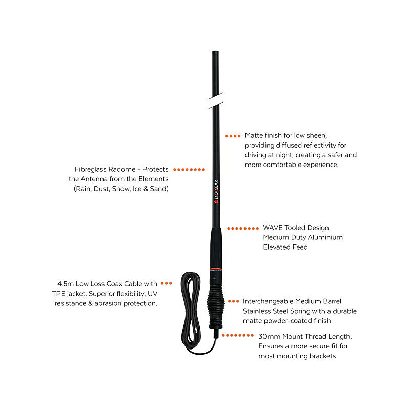 • 2.3dBi Lower Gain Antenna for Rounded Pattern Operations. Suitable for OFF-ROAD Hilly Areas & Mountainous Terrains