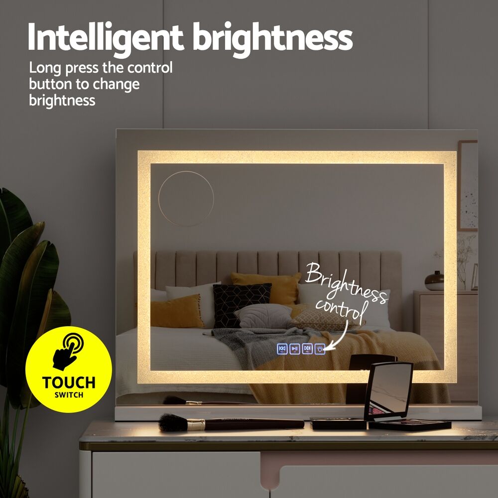 Get the star treatment you deserve with a gorgeous lighted Makeup Mirror from Embellir. Framed by LED light strips, the mirror lights up your visage to accurately complete your makeup routine. The frame is sturdy and lightweight, adding a touch of glamour to the entire mirror. The frame sits on an equally smooth powder-coated MDF base for stability and durability. The base is detachable, so you can choose to wall mount your mirror and save space. The light is easily adjustable using the mirror touch controls. Adjust for brightness and colour temperature including warm light, natural light and cool light. A built-in Bluetooth speaker allows you to listen to your favourite audiobooks, music and podcasts as you go, and the USB charging port can help keep your devices charged at all times. Turn your bedroom into a celebrity dressing room overnight with the Embellir Makeup Mirror.