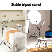 This Embellir versatile beauty light offers adjustable fill lighting, 360-degree rotation, remote control operation, variable brightness and colour temperature, dual phone holders with power options, multi-purpose usage, a handy carry bag, and a stable tripod stand.