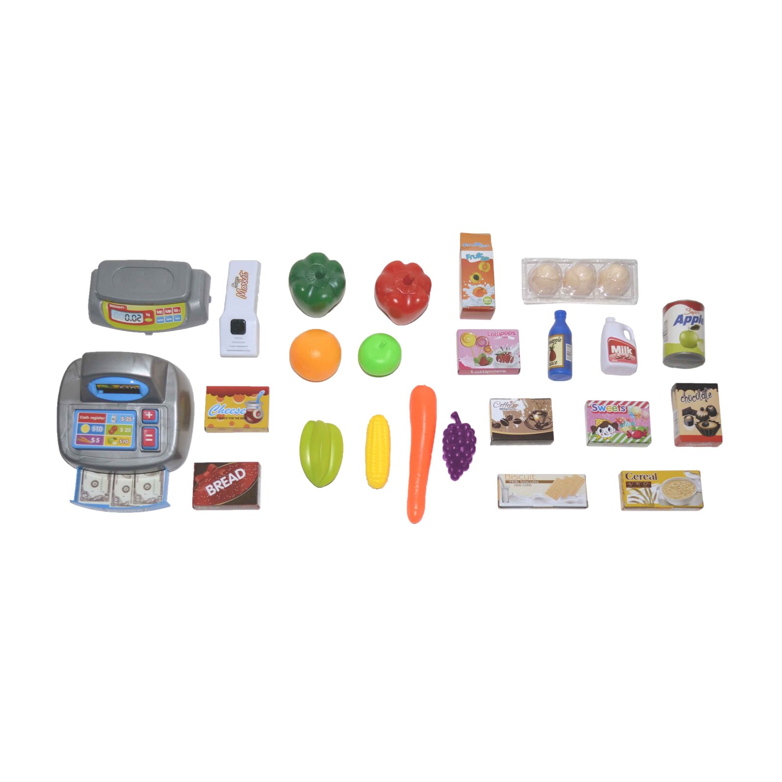 - Cash register, fake money, plastic fruits and products, counter stand, shopping cart and barcode scanner