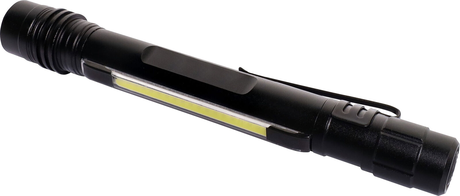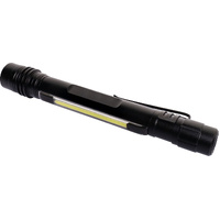 Need a torch for your pocket while you work? This handy pen light provides all the light you might need with a powerful 3W, 190 lumen beam with up to 40m range. The front of the torch can be rotated to a focus and adjust the light beam as needed. Need two hands for the job? Stand it up and turn on the 1W 80 lumen lantern light built into the side. When not in use it clips to your pocket or belt. Tough two piece aluminium casing stands up to the rigours of daily use. Provides 2 hours of light from 2 x AAA batteries (not included).