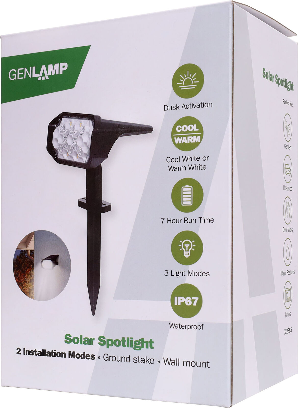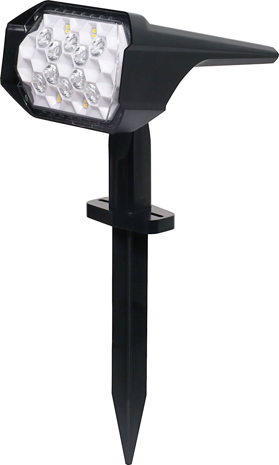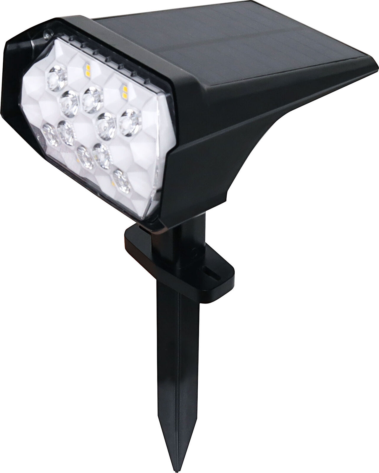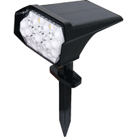 This solar spotlight is suitable for highlighting all your garden and landscape features, or to light up your pathway. The 17cm ground spike can be pushed into the soil and adjusted up to 120° to highlight trees, features or simply shed light across your driveway. Spike can also be removed for mounting to a wall if required. Can be set to floodlight beam, spotlight beam or a combined super bright beam in either cool white or warm white. Will activate at dusk and run until the battery is depleted. Requires 7 hours sunlight to charge for approx 6-7 hours lighting (depending on mode). IP67 rated for weather resistance.