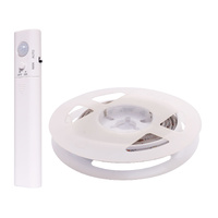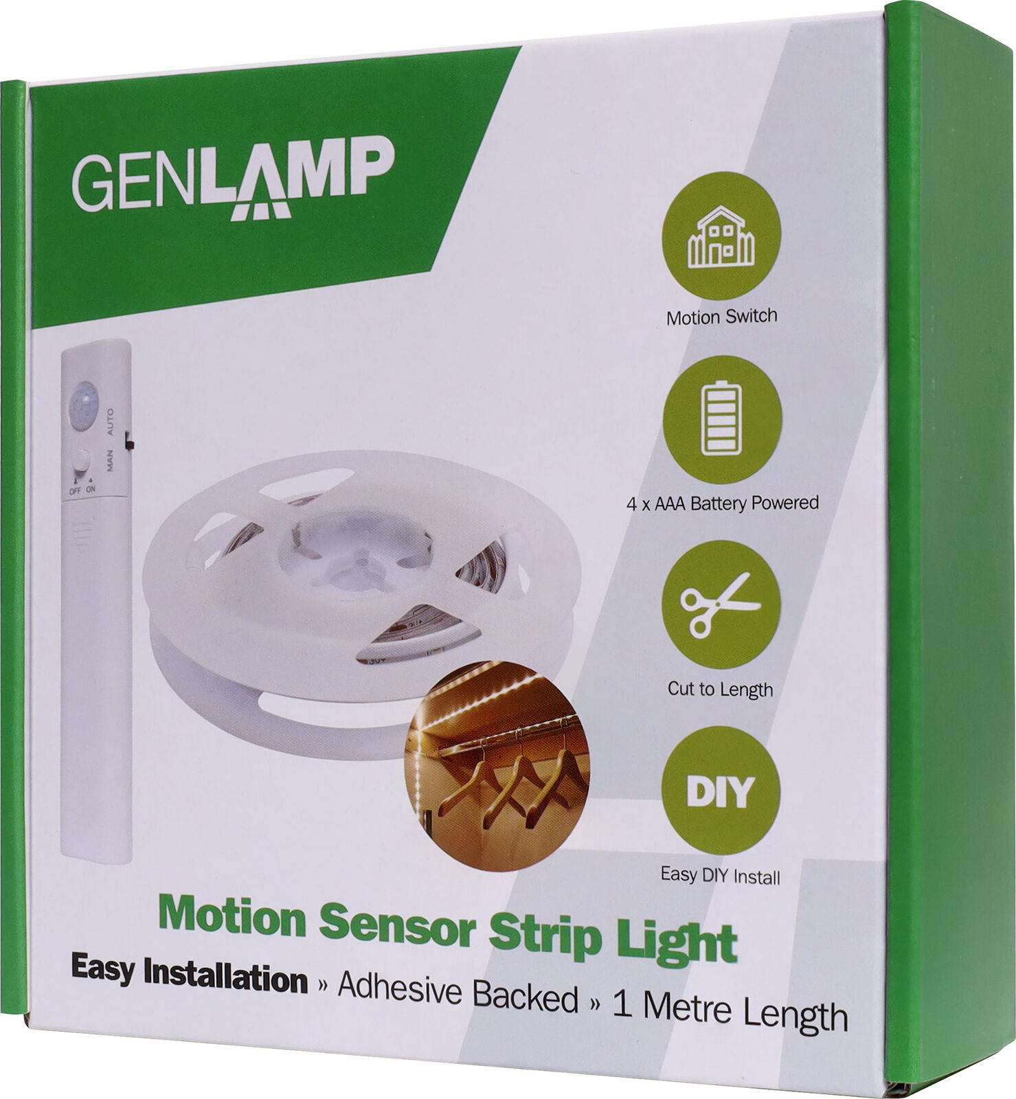 This affordable LED strip sensor light includes 1m of adhesive backed warm white LED strip and a PIR simple motion detect controller. It is ideal for wardrobes, cupboards and storage areas where LED lighting is only required when you open the door. When motion is detected the strip lights for 30 seconds. It’s fully self contained design requires no wiring and is powered by 4xAAA batteries (sold separately).