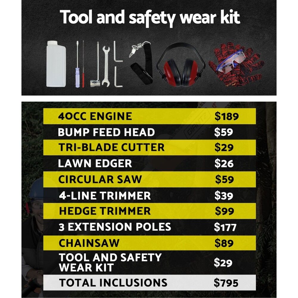 The GIANTZ Pro-series Chainsaw is the answer for people who are looking for doing serious cutting and bring it to the next level. Featuring a powerful 40cc, 4-stroke full crank engine for smoother starting and running, the chainsaw trims and cuts every gardening challenge in its path with minimum hassle. Efficient and lightweight in design and equipped with a comfortable D-handle, the chainsaw allows quick-connect coupling for easy change of attachments. In fact, up to nine attachments for every conceivable cutting job. Better still, the chainsaw also comes with three extra thick alloy extension poles which allows you to reach for those hard-to-get branches. Not least, the cutting equipment also features fine quality construction and cutting-edge technology to ensure the chainsaw remains reliable, durable and sharp consistently.