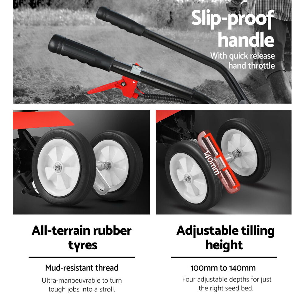 Get the earth moving quick and easy with the GIANTZ Hand-held Tiller. Featuring a 88cc 10,000rpm 2-stroke petrol motor, the tiller churns out soil deep and wide with its 24 teeth of hardened steel tines. The 4 blades allows you to till an extra-wide swath of 400mm and up to 150mm in depth. In other words, you only need one pass with the tiller to pulverise the soil and get the right seedbed for your favourite crops. Operating the tiller is just as easy with its pull-start improved engine, steady handle and quick-release hand throttle control and all-terrain rubber tyres to transform back-breaking tilling work into a ground-breaking stroll. And when the tilling is done, just fold away the tiller and store with the rest of your tools. Ideal for the home gardener or small-scale commercial grower. This item comes with 1 year warranty.