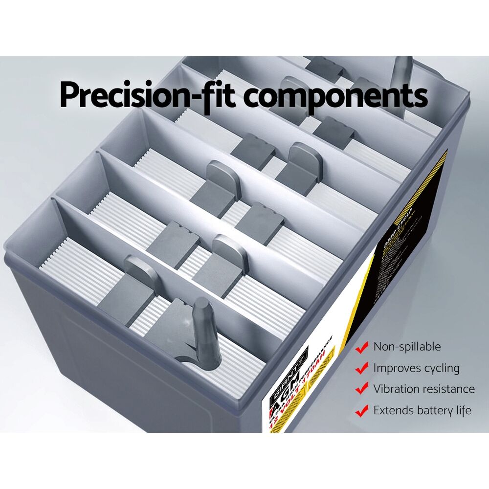 Our portable GIANTZ Deep Cycle Battery provides off-the-grid power supply for 4WD vehicles, caravans, campers, trailers, motorhomes, saltwater/marine applications, and all 12V appliances including portable fridges and washers. The 170Ah 12V battery features an incredible cycle life of up to 1400 cycles, making it one of the most enduring in its class. What you get is a longer, consistent and more drawn out charge all the time. And with its advanced AGM technology, the battery enables better electrolyte absorption, cyclic stability and frequent charging without affecting performance. The bolt down terminals also allows for more reliable experience, and not least, the high oxygen-recombination efficiency results in superior deep discharge recovery. The maintenance-free deep cycle battery is completely sealed, spill-proof and does not leak gas for added safety and durable use.