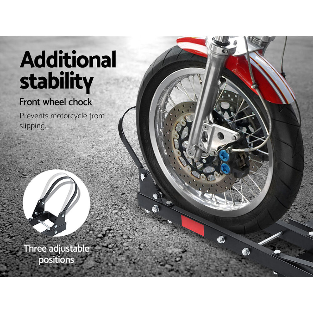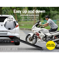 Transport your motorcycle with confidence with the Giantz Motorcycle Carrier. With its 2'' hitch mount, the carrier is compatible with most hitch receivers. Featuring heavy-duty steel construction, the carrier can carry up to 227kg (500lbs) with minimum hassle. It is also designed to enable steady and firm transport with a close-fitting front tyre channel, anti-tilt holder and front wheel chock. Both the tilt-holder and front wheel chock can be adjusted with three available positions. The loading ramp also enables easy up and down and be used either side. Not least, the carrier can also be used for cars with their tyres backed up onto the carrier.