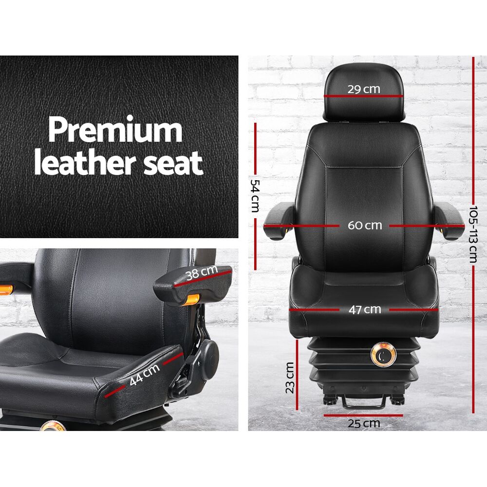 Our Tractor Seat comes with all the necessary features that make it a better working experience for you: adjustable weight suspension to accommodate weights between 50 and 130kg, adjustable headrest and backrest, foldable armrest, fore and aft sliding track adjustment of up to 150mm, and thick padded seat upholstered in high quality black PU leather for extra durability and weatherproofing. Everything is designed to take into account your requirements for a seat that matches your work environment perfectly and totally.
