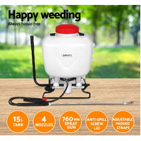 With Spring in the air, it's once again time to get out to the backyard. Forget about the laborious tasks of weeding, fertilizing and cleaning by hand – the Giantz Spot Sprayer turns your chores into an effortless job. This delivery system fits comfortably on your back for total mobility, and the large tank has a 15L capacity. The self-priming pump maintains 145psi which makes short work of your spraying. Use the spot sprayer to water the garden, spread fertilizer, dispense herbicides and pesticides, care for livestock, or do general spray cleaning around the home. The 76cm stainless steel sprayer can be used left or right-handed, has easy pressure control and features four nozzle heads for each unique job: a fan nozzle, a 4-hole nozzle, a conical nozzle and a double nozzle. It features a trigger lock to prevent unwanted spraying. Fill the tank from the 17cm opening with the integrated strainer, then seal with the anti-spill lid. Compact and portable, the Giantz Spot Sprayer makes caring for your garden easier than ever.