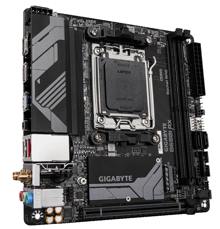 Gigabyte B650I AX Motherboard 2x DDR5~96GB,1x PCIe x16, 1x M.2, 2x SATA 6, 3x USB 3.2, 1x USB-C, 4x USB 2.0 CPU AMD Socket AM5, support for: AMD Ryzen™ 7000/ Ryzen™ 8000 Series Processors (Please refer 'CPU Support List' for more information.) Chipset AMD B650 Memory Support for DDR5 6400(OC) / 6200(OC) / 6000(OC) / 5600(OC) / 5200 / 4800 / 4400 MT/s memory modules 2 x DDR5 DIMM sockets supporting up to 96 GB (48 GB single DIMM capacity) of system memory Dual channel memory architecture Support for non-ECC Un-buffered DIMM 1Rx8/2Rx8/1Rx16 memory modules Support for AMD EXtended Profiles for Overclocking (AMD EXPO™) and Extreme Memory Profile (XMP) memory modules Onboard Graphics Integrated Graphics Processor: 1 x DisplayPort, supporting a maximum resolution of 3840x2160@144 Hz * Support for DisplayPort 1.4 version and HDR. 1 x HDMI port, supporting a maximum resolution of 4096x2160@60 Hz * Support for HDMI 2.1 version and HDCP 2.3. ** Support native HDMI 2.1 TMDS compatible ports. Wireless Communication module Realtek® Wi-Fi 6E RTL8852CE WIFI a, b, g, n, ac, ax, supporting 2.4/5/6 GHz carrier frequency bands BLUETOOTH 5.3 Support for 11ax 160MHz wireless standard Expansion Slots 1 x PCI Express x16 slot, integrated in the CPU: AMD Ryzen™ 7000 Series Processors support PCIe 4.0 x16 mode AMD Ryzen™ 8000 Series-Phoenix 1 Processors support PCIe 4.0 x8 mode AMD Ryzen™ 8000 Series-Phoenix 2 Processors support PCIe 4.0 x4 mode * The PCIEX16 slot can only support a graphics card or an NVMe SSD. Storage Interface 1 x M.2 connector , integrated in the CPU, supporting Socket 3, M key, type 2280 SSDs: AMD Ryzen™ 7000 Series Processors support PCIe 4.0 x4/x2 SSDs AMD Ryzen™ 8000 Series-Phoenix 1 Processors support PCIe 4.0 x4/x2 SSDs AMD Ryzen™ 8000 Series-Phoenix 2 Processors support PCIe 4.0 x4/x2 SSDs 2 x SATA 6Gb/s connectors RAID 0 and RAID 1 support for NVMe SSD storage devices RAID 0 and RAID 1 support for SATA storag