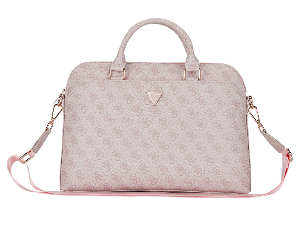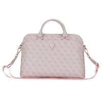 The Guess 4G Triangle Logo Zipper Pocket 15/16" Laptop Bag Pink is a sleek and stylish carry solution designed for professionals and trendsetters alike. Showcasing Guess's iconic 4G monogram and the distinguished triangle metal logo, this laptop bag exudes elegance and practicality.