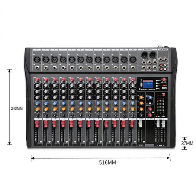 Powerful 12-Channel Mixer for DJs, Live Performances, and Outdoor Events The Hridz CT-120S is a robust 12-channel audio mixer designed for high-performance sound control in various settings, including outdoor events, live shows, DJ performances, and studio setups. Equipped with 48V phantom power, this mixer supports condenser microphones, ensuring clear and dynamic sound quality.