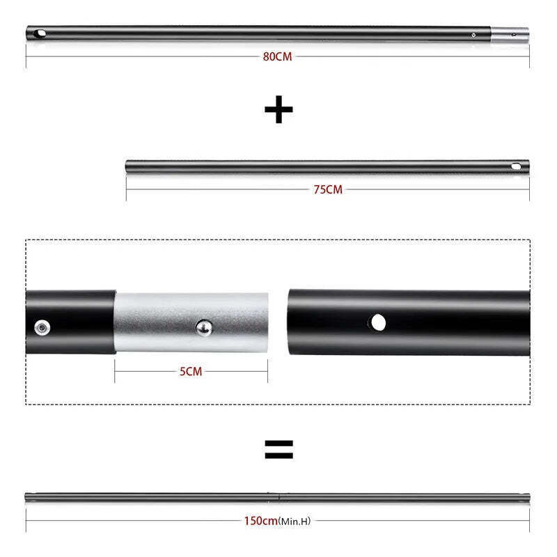 Tripod consists of 3 adjustable sections (25mm-22mm-19mm-16mm diameter), height up to approx. 260cm maximum.