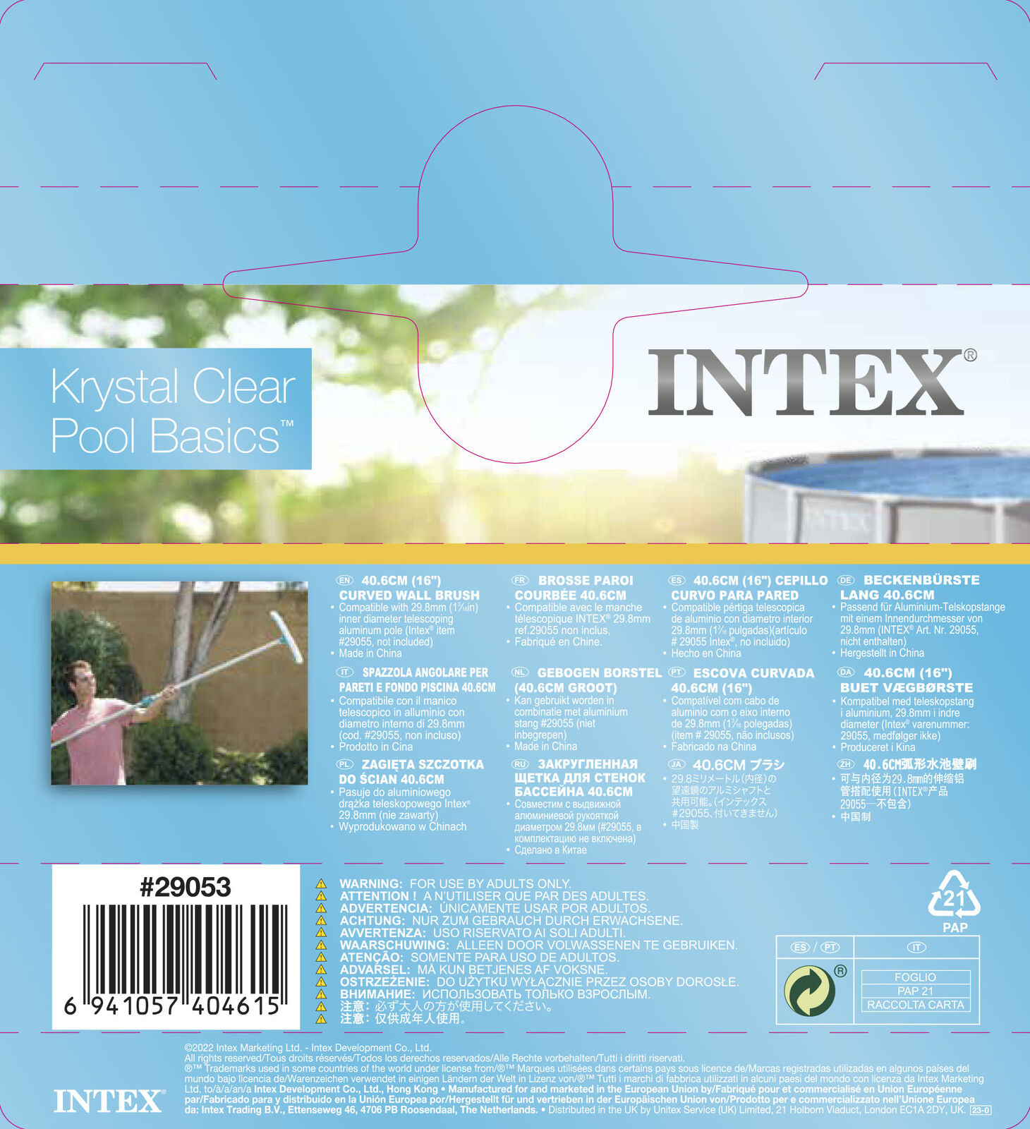 • Easily and quickly remove algae and grime from pool walls or the pool floor with the Intex� 16in Curved Wall Brush. The convenient curved brush shape is ideal for pool cleaning and maintenance. The brush is compatible with the 29.8mm inner diameter telescoping aluminum shaft (sold separately).Curved brush ideal for pool cleaning and maintenanceQuickly remove algae and grime from pool walls or floorCompatible with 29.8mm inner diameter telescoping aluminum pole (item# 29055, sold separately)
