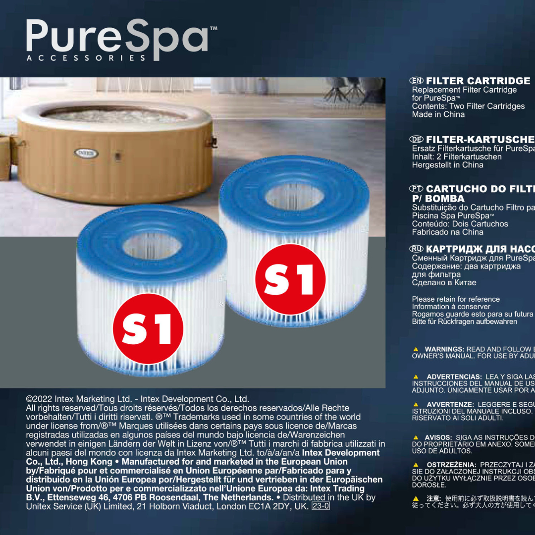 Keep your spa water clean and Intex PureSpa performing at its best by using genuine Intex PureSpa Type S1 Pool Filter Cartridges. This is the authentic replacement cartridge for your Intex PureSpa. It works with all Intex PureSpa models. Replace your filter cartridges regularly for the best results. It is recommended that you replace cartridges every 2 weeks to maximize your spa's performance. Pack of 2 genuine Intex Type S1 filter cartridgesThe S1 Cartridge Filter is sure to keep your PureSpa Jet Massage water clean and freshMade with easy-to-clean, heavy-duty Dacron paper for the ultimate filtrationFor maximum efficiency, clean cartridges each week and replace once a month or soonerWorks with all Intex PureSpa models