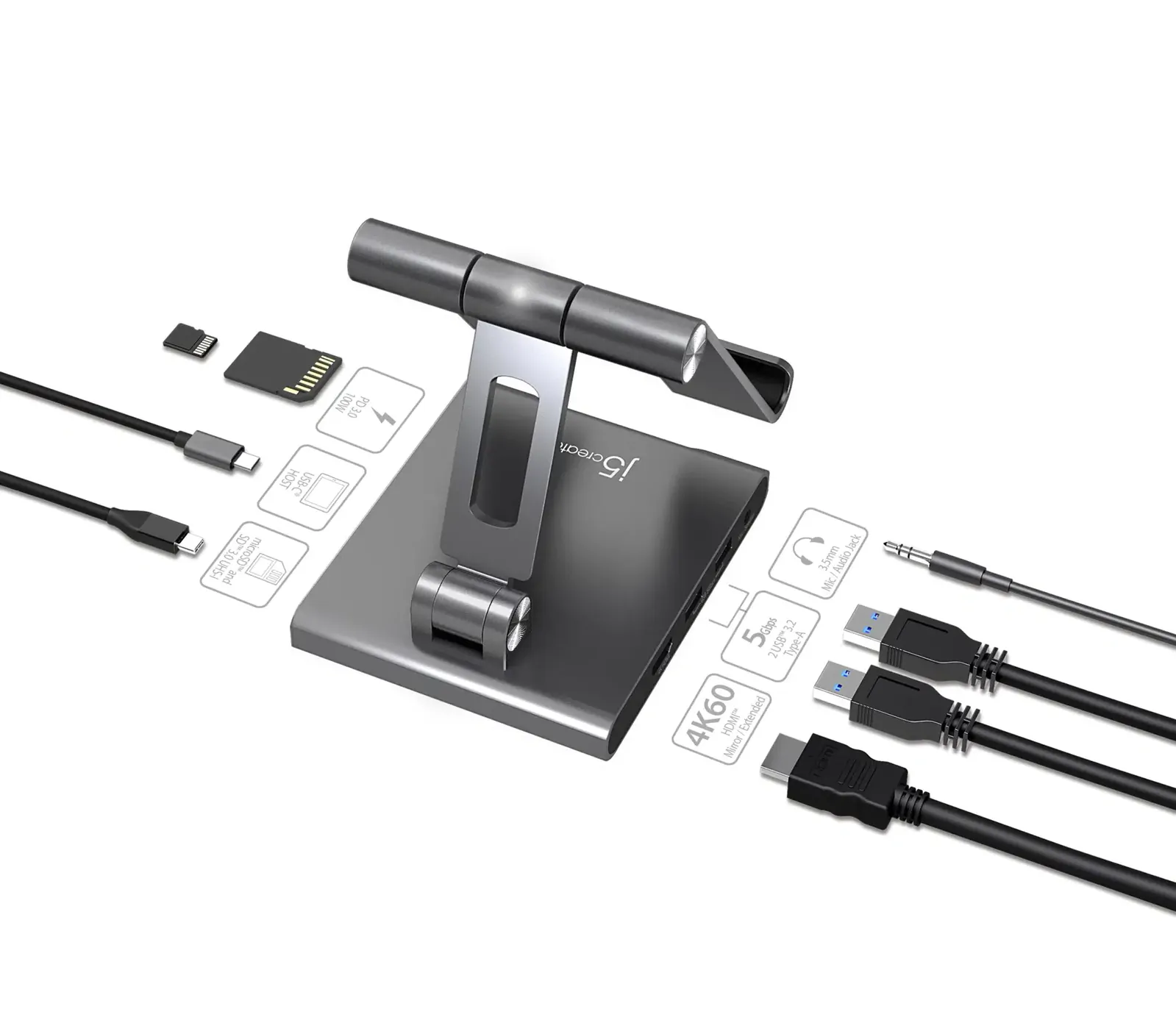 J5create JTS224 Multi-Angle Stand Docking Station for iPad, Samsung Tablet, Surface Pro 8 (USB-C to 4K HDMI, USB-C 100W PD, USB-Ax2, SD card reader).JTS224 is made of durable aluminium and is designed to support iPad Pro and iPad Air.It is foldable for easy transportation and storage. The viewing angle can be adjusted to your liking and improves your viewing experience.The integrated USB-C docking station includes an HDMI 2.0 port, two USB Type-A 5Gbps ports, SD / microSD 3.0 card reader, audio/mic combo jack and PD 100W pass-through (requires seperate power supply), giving you the connections you need for increased productivity.