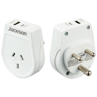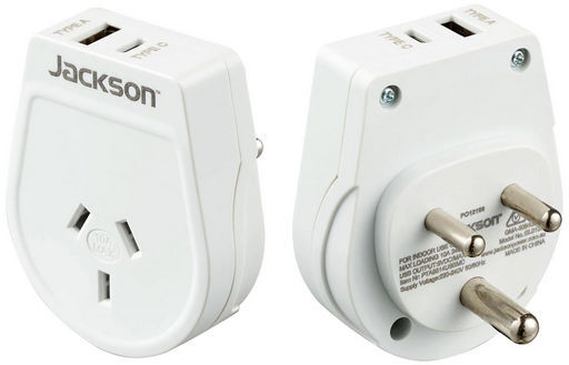 This outbound travel adaptor converts appliances with AU/NZ plugs to suit overseas power sockets. Includes 1x USB-A and 1x USB-C charging ports (5V 2.1A max). Compatible with Indian and Sri Lankan style sockets. 220-240Vac 50/60Hz. 10A max current. DOES NOT CONVERT VOLTAGE.
