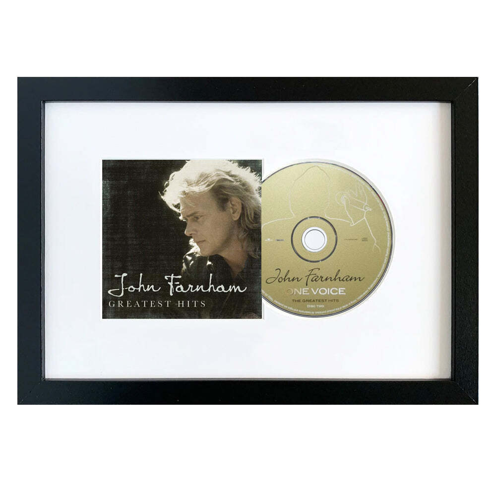 Framed John Farnham 'Greatest Hits' CD Album Art is one of our lifetime's most recognisable and significant albums. We are eager to honour and showcase your favourite artists by framing the actual original artist's CD cover and the CD itself. This CD is framed using all-wood profiles, archival matting, and UV-filtering non-glare acrylic. The cover artwork is presented in full, while the actual CD peeks out of the side. The outer dimensions of each frame are WH 32.5cm x 23.5cm.