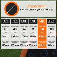 Please measure the DIAMETER of your mat, the number of spring LOOPS and the LENGTH of your springs to ensure the mat is the correct size. Please choose your product carefully. Incorrectly purchased items will only be accepted for store credit if they are returned to us at the buyers' expense, in their original condition and packaging, exhibiting no sign of testing, nor use, and subject to a 30% re-stocking fee on the purchase price of the product.Size: 8ft (suits 135mm springs), spring loops: 48Size: 10ft (suits 135mm springs), spring loops: 64Size: 12ft (suits 165mm springs), spring loops: 72Size: 13ft (suits 165mm springs), spring loops: 84Size: 14ft (suits 165mm springs), spring loops: 96Size: 15ft (suits 165mm springs), spring loops: 108Size: 16ft (suits 185mm springs), spring loops: 108