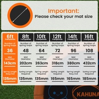 Please measure the DIAMETER of your mat, the number of spring LOOPS and the LENGTH of your springs to ensure the mat is the correct size. Please choose your product carefully. Incorrectly purchased items will only be accepted for store credit if they are returned to us at the buyers' expense, in their original condition and packaging, exhibiting no sign of testing, nor use, and subject to a 30% re-stocking fee on the purchase price of the product.Size: 6ft (suits 135mm springs), spring loops: 36