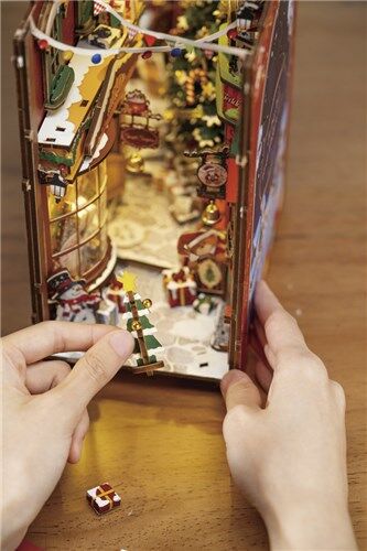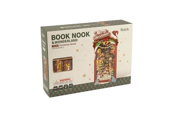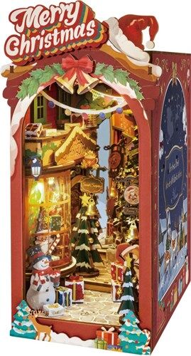 In an atmospheric Christmas alley, shops with small windows give a cozy look. The snow is piled up here and there on the street by the fresh wind. At the end, a decorated Christmas tree shines in the evening light. In a corner between the Christmas presents, a snowman smiles happily. The shop with funny toys attracts the curious glances of children and brings the magic of Christmas to life. Every corner and every facade of this charming alley screams Christmas. You will craft this beautiful wooden construction kit, of a red book nook with Merry Christmas on the facade, yourself!
