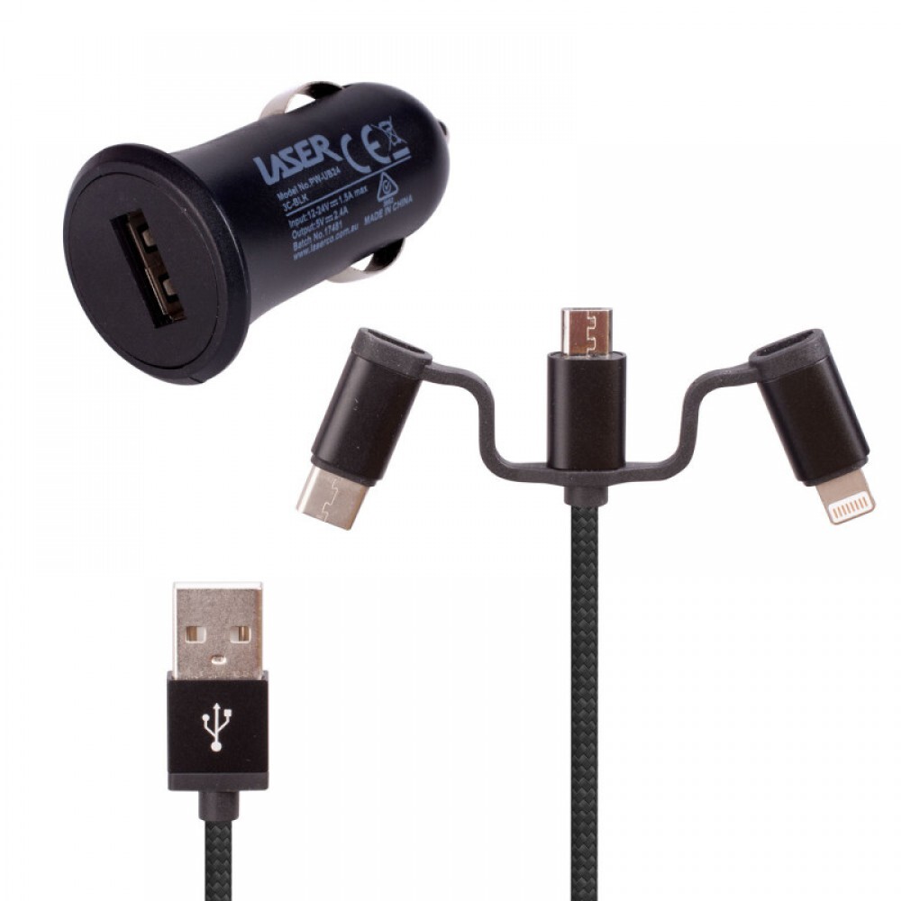 The car charger by Laser comes with 3 separate charging point types, i.e. a micro-USB, iDevice - fast USB Type C and a 9-pin charging point.