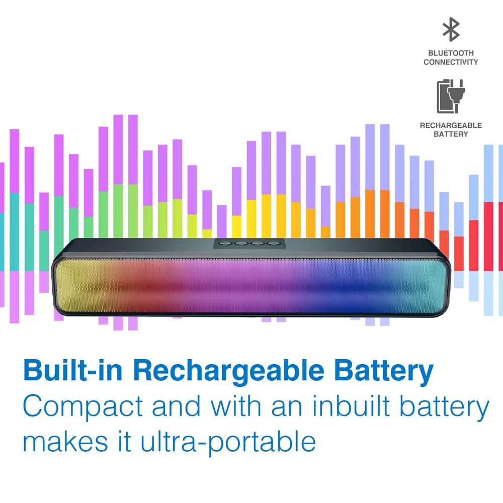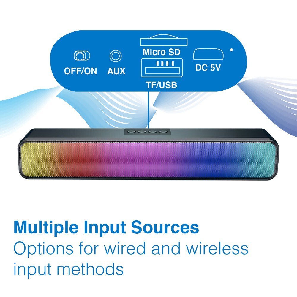 The soundbar offers multiple input sources including AUX, USB, and MicroSD, allowing you to play music directly from portable storage devices or connect to traditional A/V equipment. Its compact size, just 38 cm long, makes it easy to fit beneath a monitor or TV, while its portability allows you to take it anywhere from your desk to a friend's house, or even outdoors.