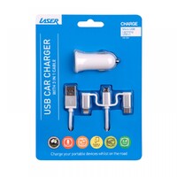 Stay powered up while driving with the Laser USB Car Charger, featuring a 3-in-1 charging cable for universal compatibility. Whether you need to charge a Micro USB, Type-C, or iDevice device, this car charger has you covered.