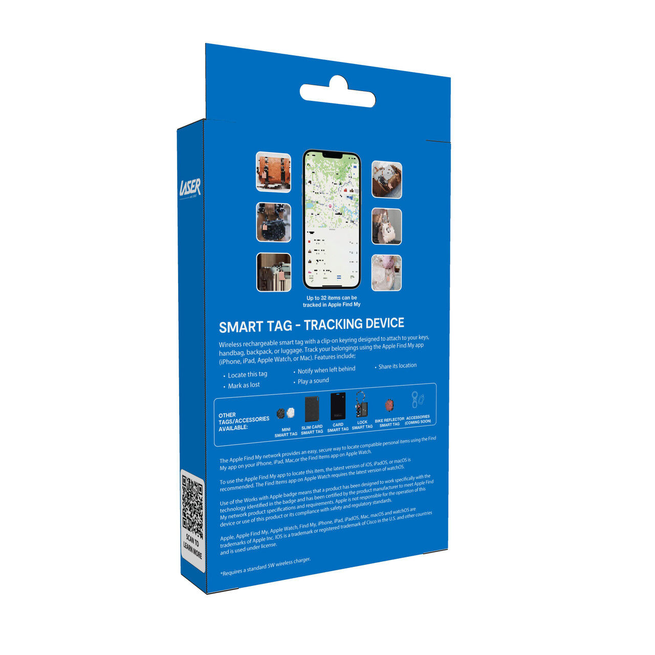The Laser Smart Tag Key Ring easily attaches to keys or bags and works with Apples Find My network.