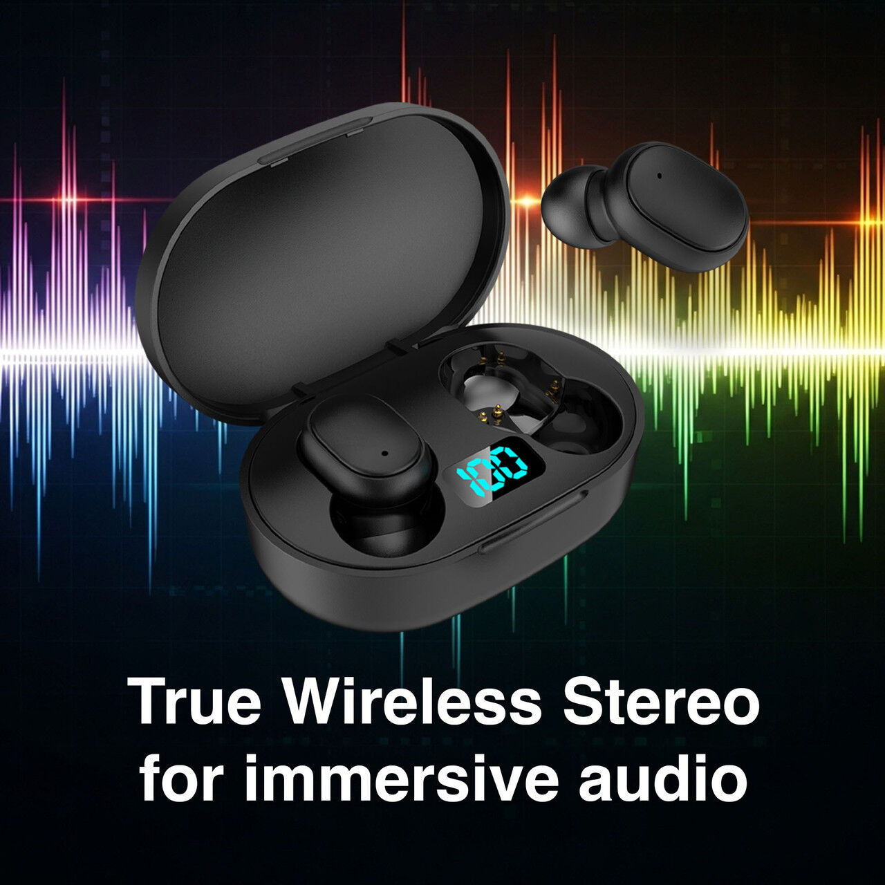Compact true wireless earphones with LED battery display for music, calls and everyday use.