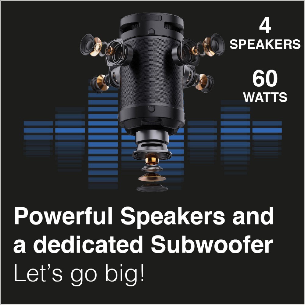 Experience audio like never before with the SoundTec Party Blaster's 4.1 channel surround sound. The speaker boasts an impressive total RMS power output of 30W, with a peak power output of 60W, ensuring your music is always loud and clear. The combination of four tweeters and a dedicated subwoofer delivers well-defined highs, balanced mids, and heart-thumping bass that will elevate your listening experience.