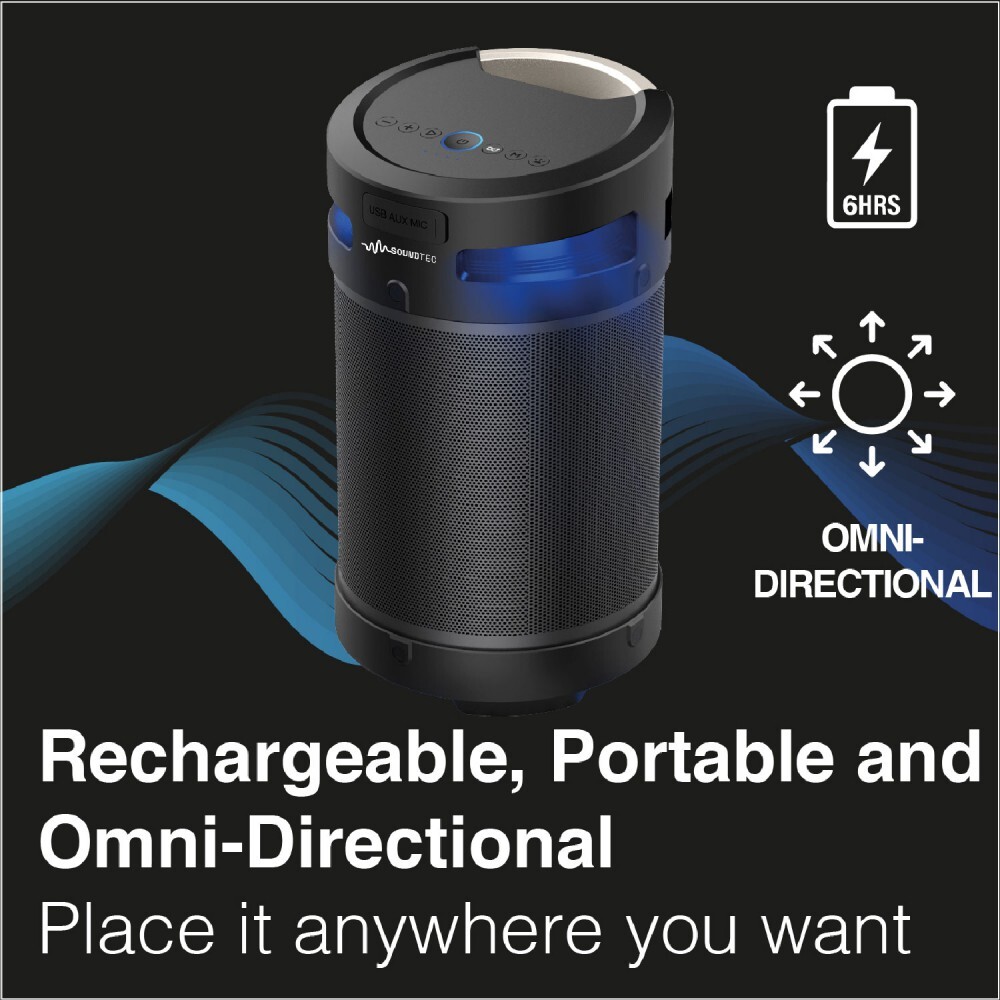 The SoundTec Party Blaster is designed with portability in mind. Its compact size and lightweight design make it easy to take your music wherever you go. The built-in rechargeable lithium-ion battery provides up to 6 hours of playtime on a single charge (at 50% volume), ensuring the party never has to stop.