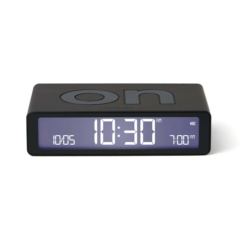 Lexon Flip Classic Reversible Alarm Clock - Black - Fun and equipped with two faces (ON / OFF), the alarm clock must be turned down to be activated or deactivated with a simple gesture. Thanks to its integrated touch control, you just have to touch it to trigger the light of its LCD display. In addition, Flip Classic features some discreet buttons on its back to set the time/date format, alarm and screen brightness. Designed to be your ultimate bedside companion, Flip Classic boasts a 6-month battery life, rechargeable via USB-C. A battery indicator is visible on screen so you’ll easily know when to recharge your device.