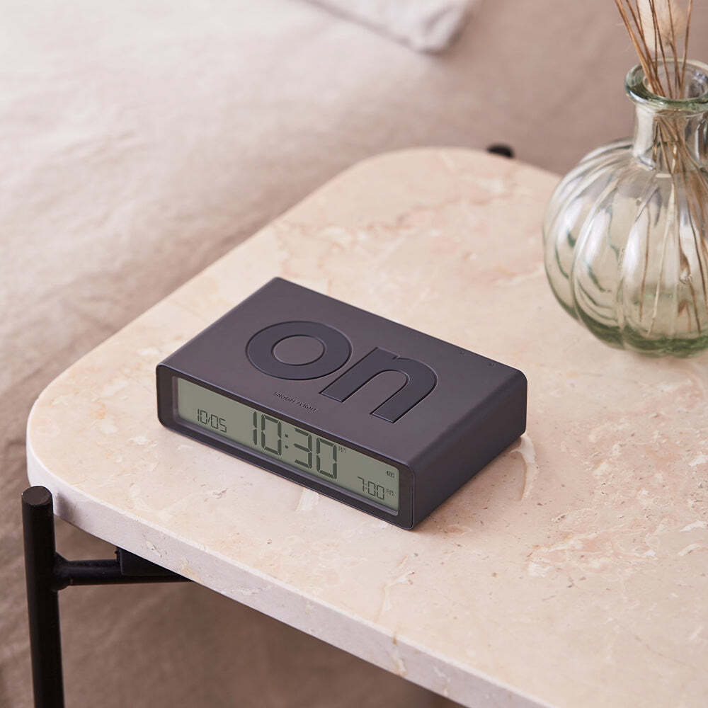 Lexon Flip Classic Reversible Alarm Clock - Grey - Fun and equipped with two faces (ON / OFF), the alarm clock must be turned down to be activated or deactivated with a simple gesture. Thanks to its integrated touch control, you just have to touch it to trigger the light of its LCD display. In addition, Flip Classic features some discreet buttons on its back to set the time/date format, alarm and screen brightness. Designed to be your ultimate bedside companion, Flip Classic boasts a 6-month battery life, rechargeable via USB-C. A battery indicator is visible on screen so you’ll easily know when to recharge your device.