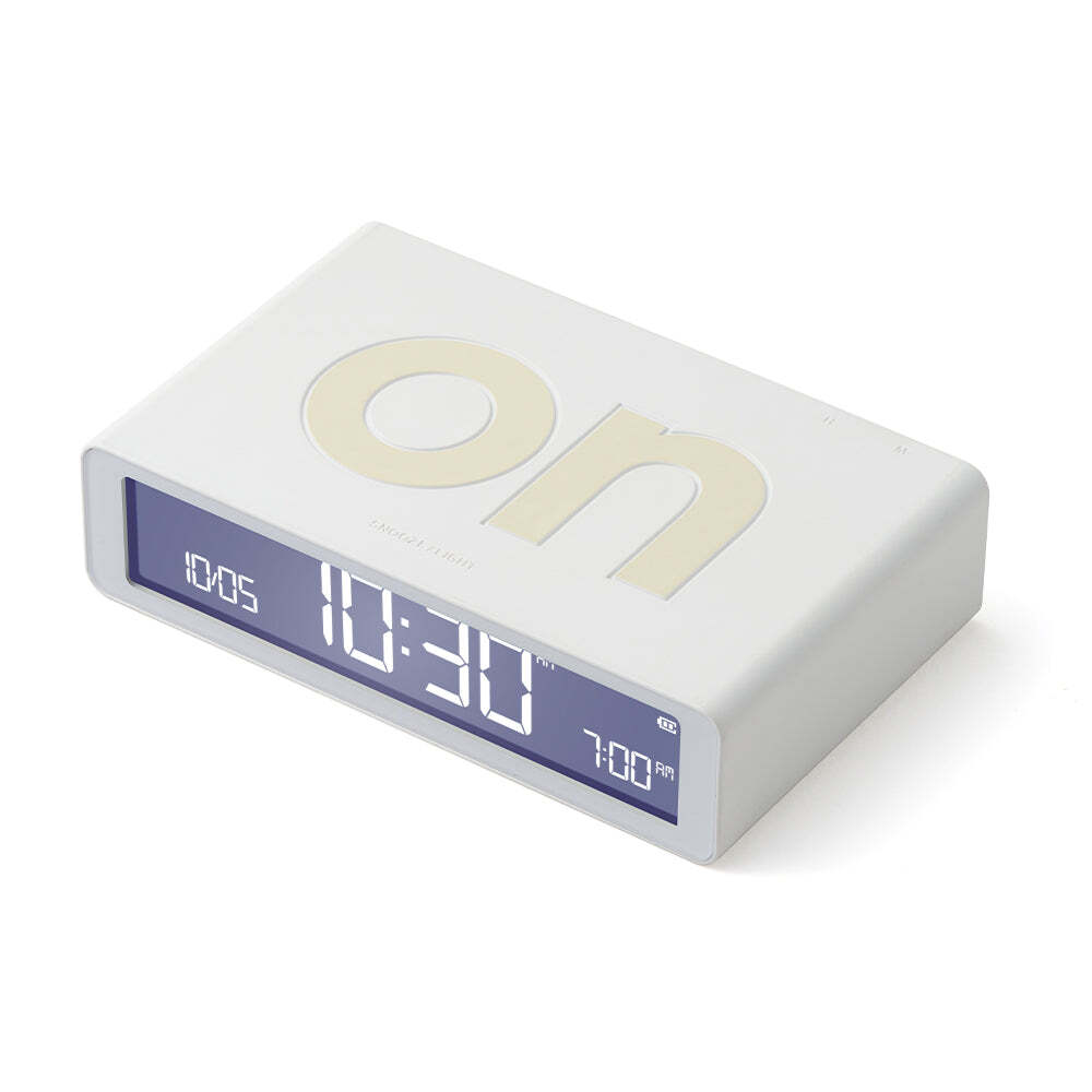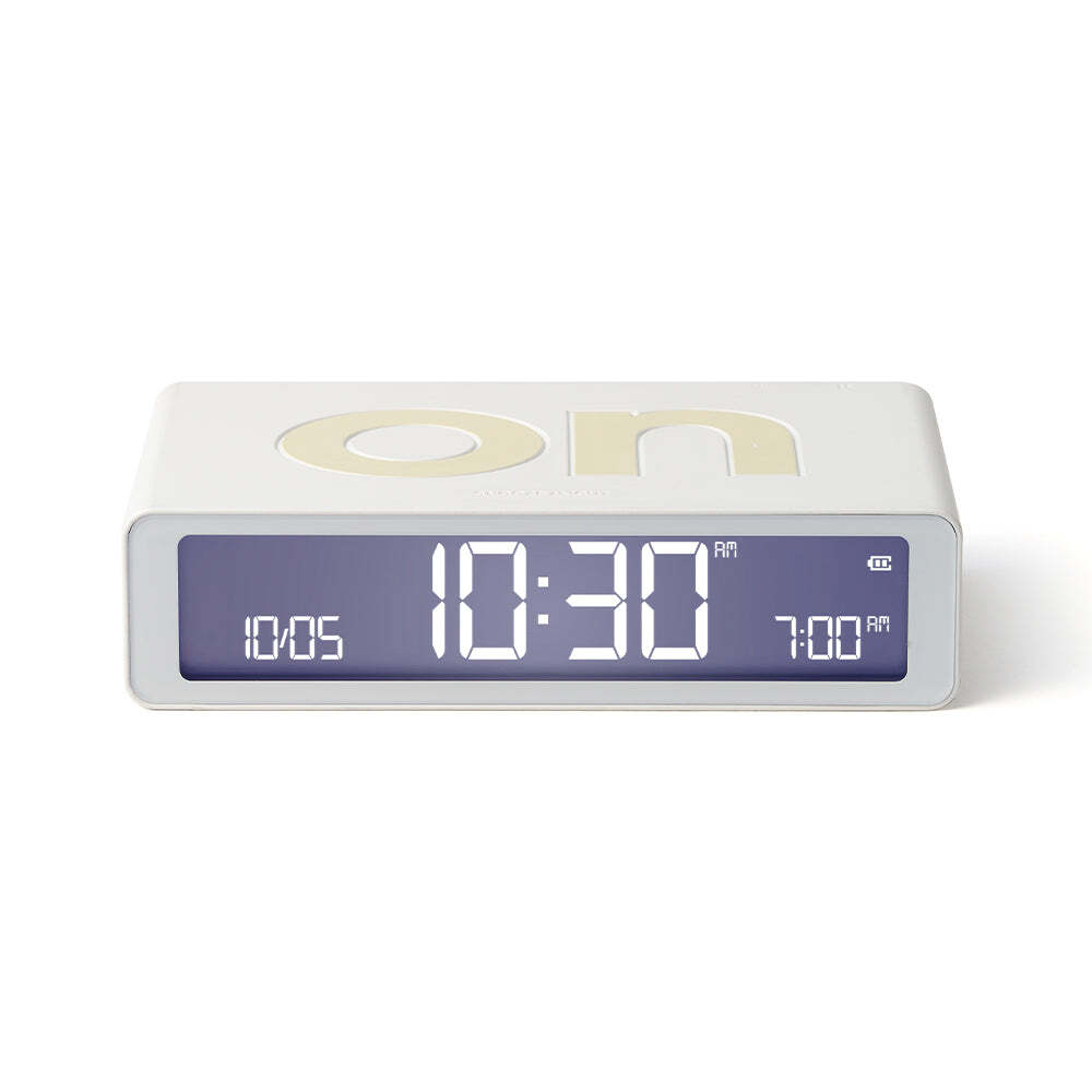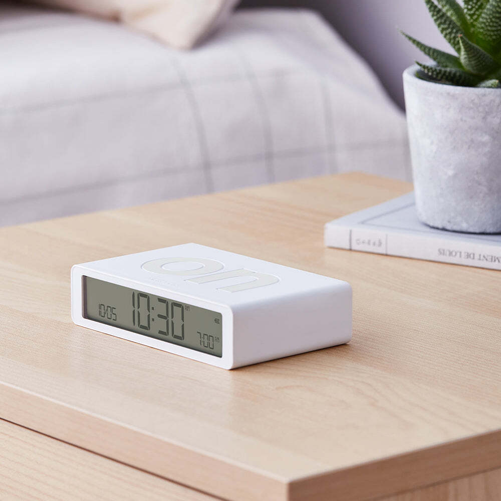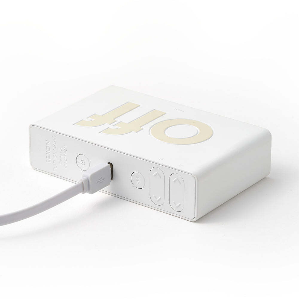 Lexon Flip Classic Reversible Alarm Clock - White - Fun and equipped with two faces (ON / OFF), the alarm clock must be turned down to be activated or deactivated with a simple gesture. Thanks to its integrated touch control, you just have to touch it to trigger the light of its LCD display. In addition, Flip Classic features some discreet buttons on its back to set the time/date format, alarm and screen brightness. Designed to be your ultimate bedside companion, Flip Classic boasts a 6-month battery life, rechargeable via USB-C. A battery indicator is visible on screen so you’ll easily know when to recharge your device.