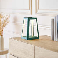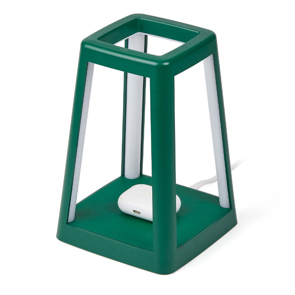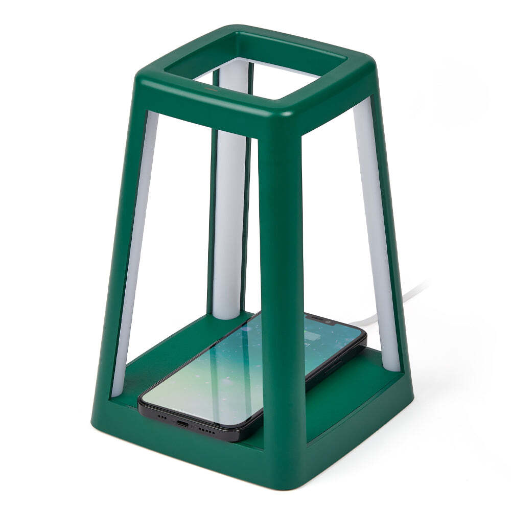 Lexon Lantern Portable Lamp With Built-In Wireless Charger - Green - With the Lantern, you have complete control over your lighting setup. Simply press the touch button situated at the top of the lamp to switch between cool or warm white light, or select one of the 7 different LED colors available. Thanks to its dimmer function, you can adjust the brightness to suit your preferences, crafting the ideal atmosphere for any occasion. In addition to illuminating your space, the Lantern is also equipped with a built-in 15W wireless charger. Say goodbye to bulky cables! Simply place your smartphone or any other Qi-compatible device on the lamp base for fast and convenient charging. Crafted to be as beautiful as it is functional, the Lantern is perfectly suited for outdoor use, thanks to its IPX4 certification. Whether it's for an outdoor gathering or a picnic, the Lantern is your ideal companion. Get the most out of the Lantern's light during your evenings with its impressive battery life of up to 8 hours. Simply recharge it via USB-C using the provided cable.