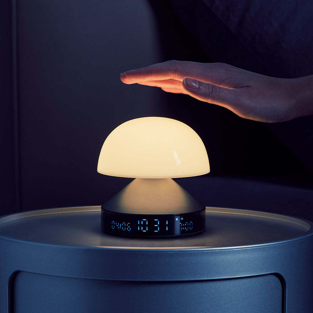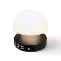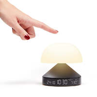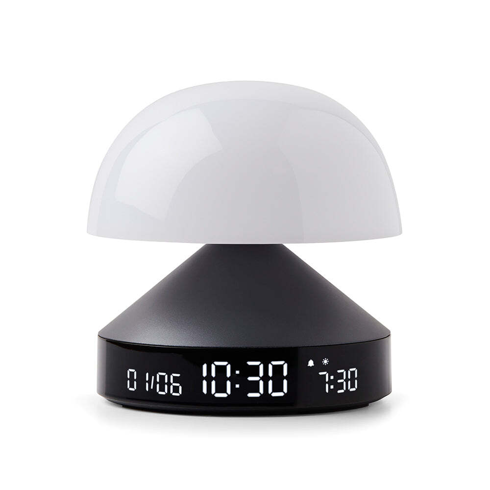 Lexon Mina Sunrise Sunrise Alarm Clock - Gunmetal - Mina Sunrise is a 3-in-1 lamp with sunrise and sunset effects, alarm clock and multicolored lighting. Wake-up gently thanks to the progressive daylight simulator combined with natural sounds at the desired time. Use the sunset function to fall asleep peacefully. 30 minutes before the set wake-up time, dark blue tones gradually change into warm white to block melatonin and assist you to get up naturally, in a good mood and feeling rested. At night, when sunset mode is on, Mina Sunrise switches from orange to red light to help trigger sleep. With its compact shape, aluminum base and high-quality display, Mina Sunrise has been designed to complement your nightstand and to be easy to interact with. Pressing the top of the lamp will turn the light on/off, choose among the 9 LED color, adjust brightness, or stop the ongoing alarm.