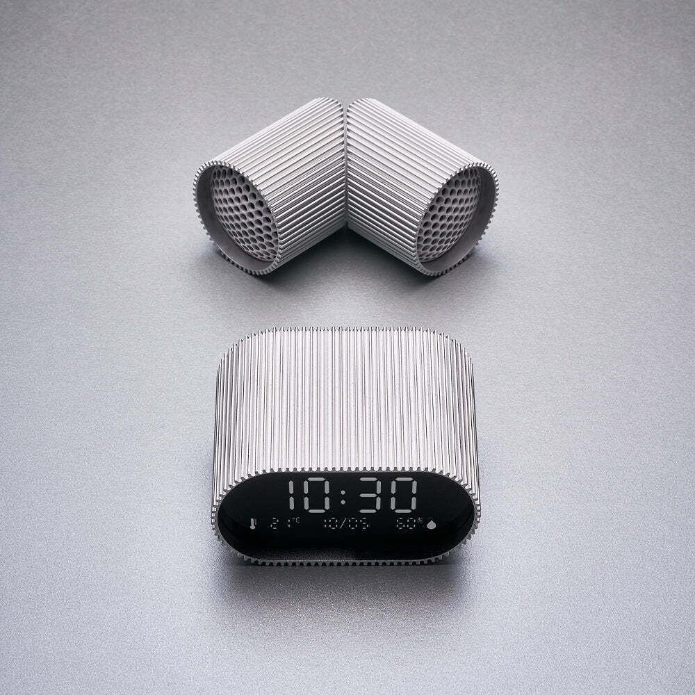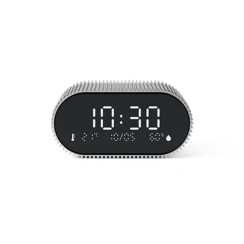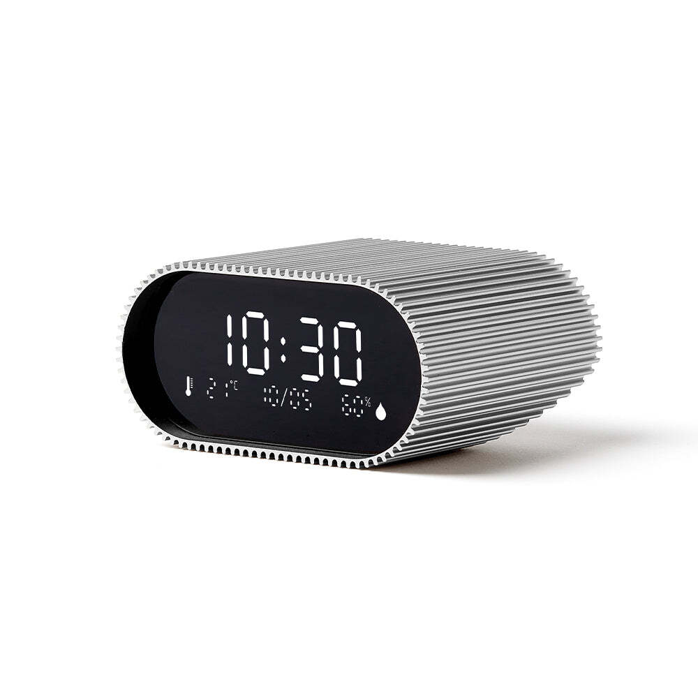 Lexon Ray Clock Lcd Alarm Clock With Temperature / Humidity Display - Alu Polish - Discover Ray Clock alarm clock, the essential companion for gentle awakenings and peaceful nights. Equipped with a pure black VA LCD screen ensuring clear visibility at all times, ambient temperature and humidity sensors, it displays useful information for your daily well-being. Designed to be easy to use, simply tilt the alarm clock on its base to disable it and upright it to activate it. Ray Clock offers a wide choice of melodies and natural sounds to wake you up gently. Its night mode allows you to sleep peacefully, without being disturbed by the light of the screen. Ray Clock features a minimalist and elegant design, with its case made entirely of aluminum with unique stripes which will bring a touch of modernity to your room. Available in many colours, it will fit harmoniously into your interior. Offering up to 6 months of battery life, Ray Clock is rechargeable via USB-C. Say goodbye to the hassle of dead batteries! You can rely on your alarm clock to accompany you for several months without worrying about frequent recharging.