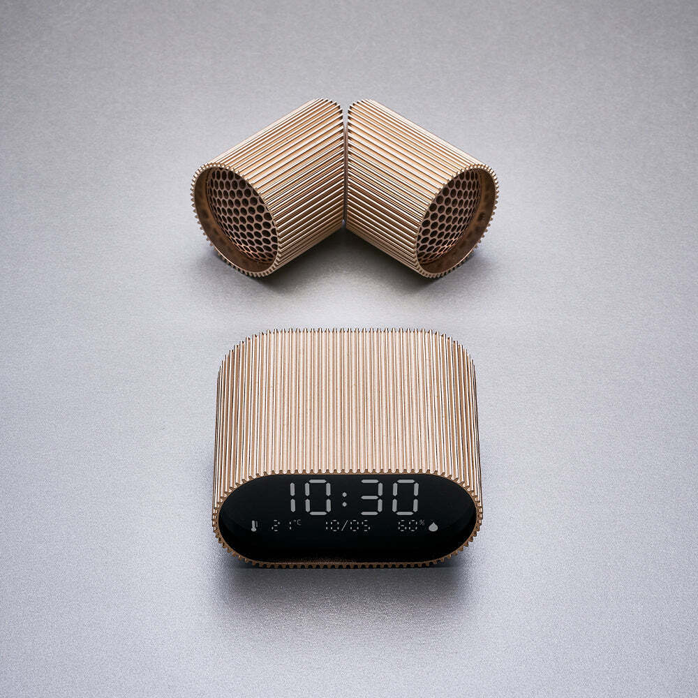 Lexon Ray Clock Lcd Alarm Clock With Temperature / Humidity Display - Gold - Discover Ray Clock alarm clock, the essential companion for gentle awakenings and peaceful nights. Equipped with a pure black VA LCD screen ensuring clear visibility at all times, ambient temperature and humidity sensors, it displays useful information for your daily well-being. Designed to be easy to use, simply tilt the alarm clock on its base to disable it and upright it to activate it. Ray Clock offers a wide choice of melodies and natural sounds to wake you up gently. Its night mode allows you to sleep peacefully, without being disturbed by the light of the screen. Ray Clock features a minimalist and elegant design, with its case made entirely of aluminum with unique stripes which will bring a touch of modernity to your room. Available in many colours, it will fit harmoniously into your interior. Offering up to 6 months of battery life, Ray Clock is rechargeable via USB-C. Say goodbye to the hassle of dead batteries! You can rely on your alarm clock to accompany you for several months without worrying about frequent recharging.