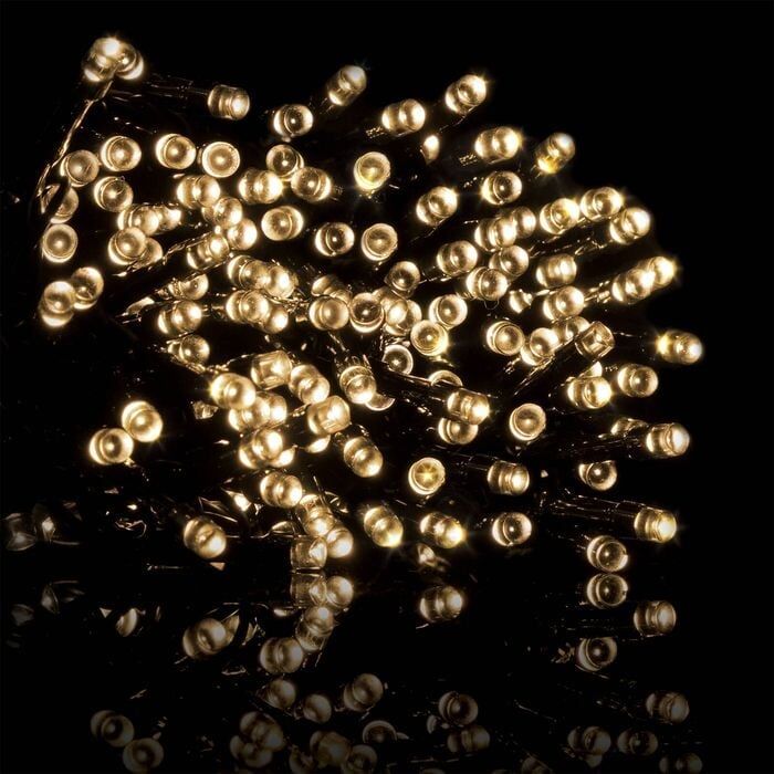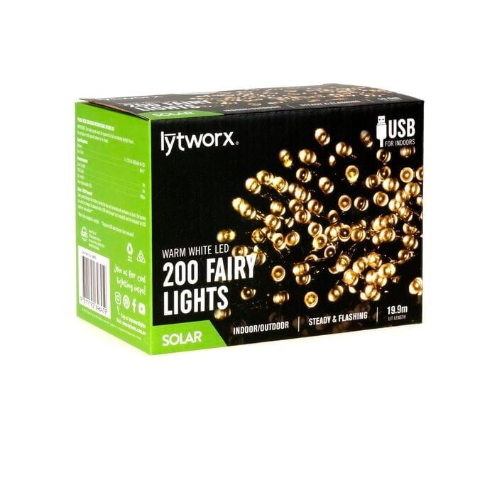 Lytworx set of 200 warm white fairy lights would make the perfect addition to any indoor or outdoor space. Bring a spectacular glow to gardens, balconies, bushes, trees, as well as living rooms, home offices, bedrooms and much more. With a 19.9m lit length, these lights will effortlessly add glamour and charm to any space. Customisation has been made easy with two distinct lighting modes to choose from, steady and flashing. This functionality allows you to browse between settings at the click of a button. Lytworx warm white LED fairy lights are the premier lighting solution for comfort, convenience, and design. Energy and cost-efficient, these lights can be powered with an included solar panel or using a USB wall charger. The solar panel charges the battery during the day and automatically activates at dusk. The battery can also be charged and powered with a USB wall charger (not included) and the included 1m USB cable for use indoors.