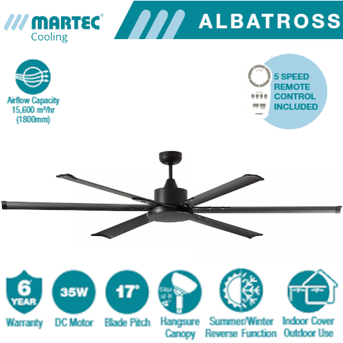 The Albatross 72" DC ceiling fan is a powerful and efficient ceiling fan thanks to its 35W brushless DC motor. The ceiling fan . This ceiling fan Includes a 5 speed remote control with a timer and reverse functions, for added convenience.