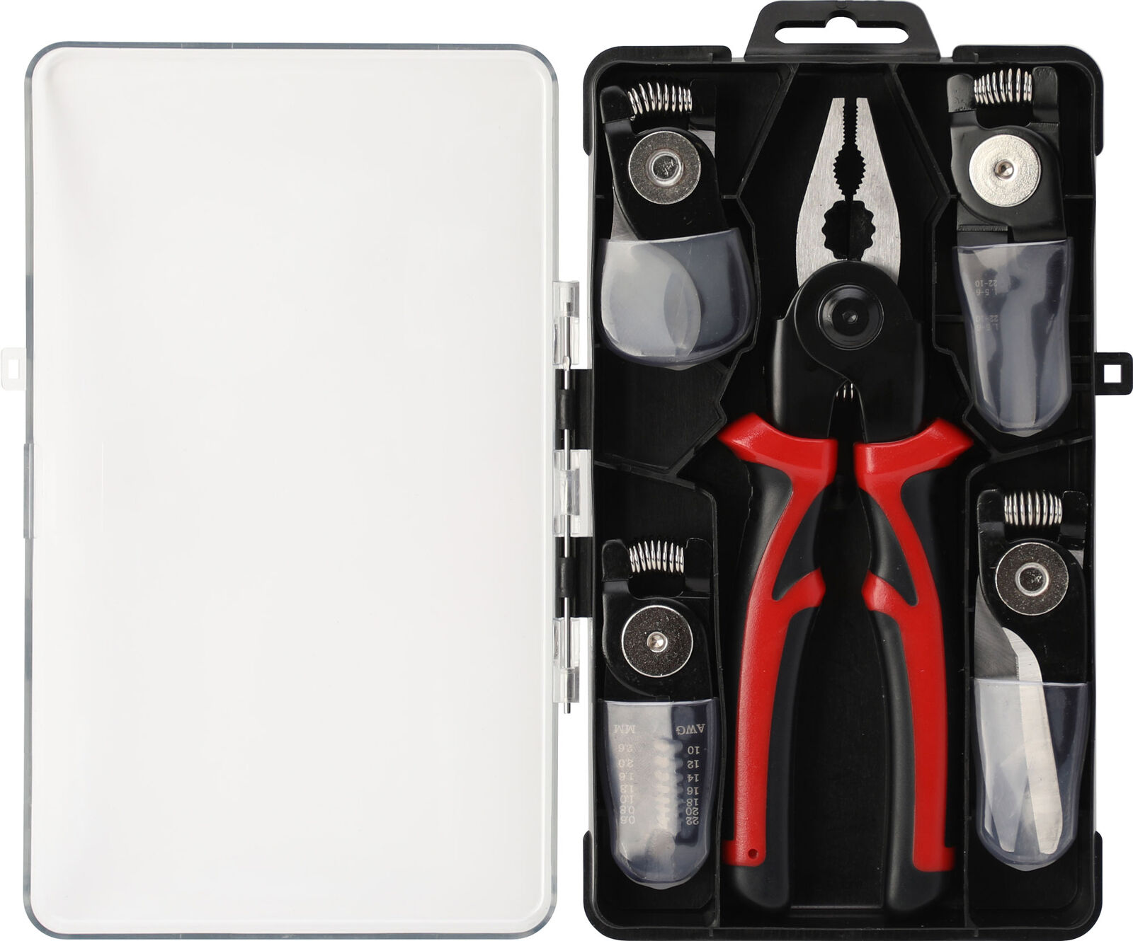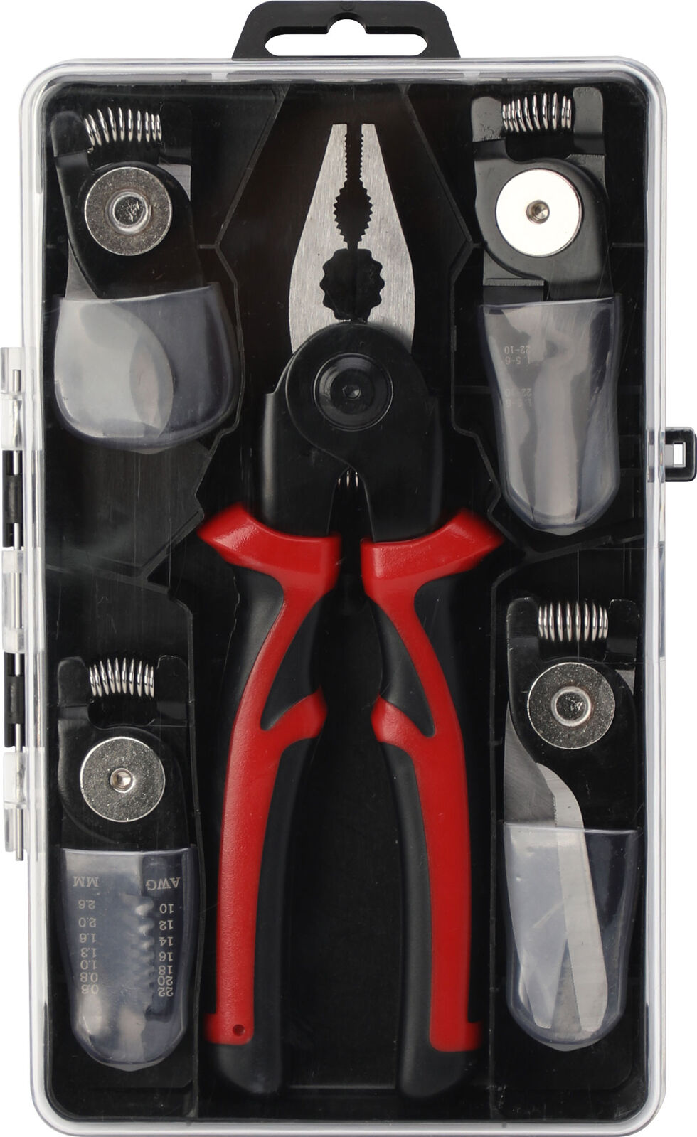This versatile 5-in-1 plier set features interchangeable heads designed for a range of tasks. Each head fits securely into the ergonomic handle and allow for quick and easy swapping between tools. Compact and convenient, it’s ideal for workshop and DIY use—perfect for wire cutting and stripping, crimping connectors, trimming thin materials, and more. By combining five essential tools into one, this set saves valuable space in your toolbox. Everything is neatly organized in a handy, portable carry case.
