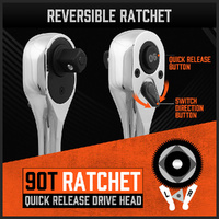 Reversible 90 tooth head, 5 ratcheting arc allows you to turn fasteners in tight spaces. The quick-release reversible head design is used to replace the socket by touching the middle part, and the driving direction can be changed by flipping the biased drive switch.