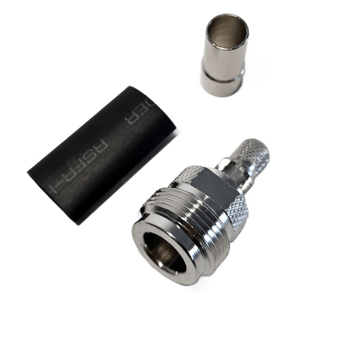This N Female crimp connector is used to terminate RG-58 and LMR-195 (or equivalent) series braided coaxial cables. Installation is very simple. After preparing the cable, the connector is slid over the cable until the cable’s centre conductor sits within the solder-cup that has been pre-fitted inside the connector. The conductor is then soldered in place. A standard 6.5 mm (0.255″) hex die is used to crimp the ferrule.