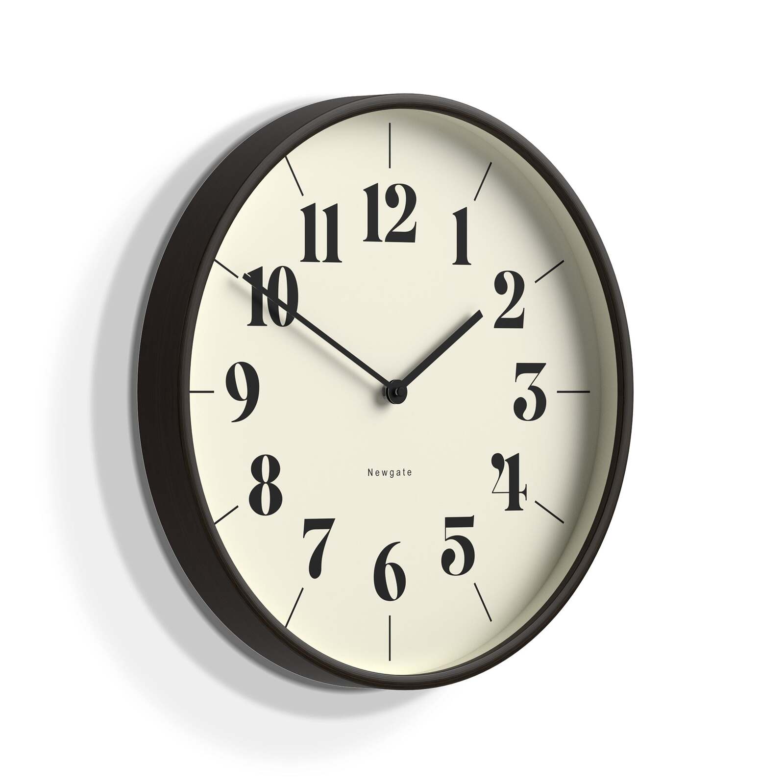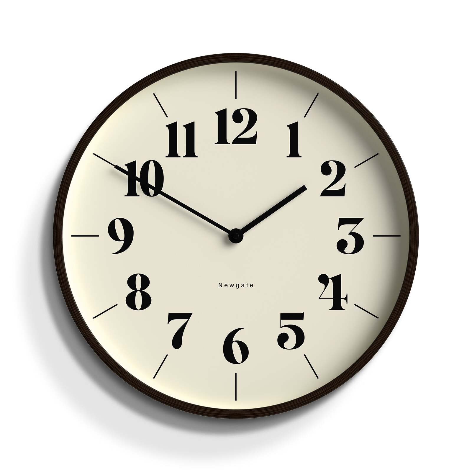 Newgate Mr Clarke Clock Dark Wood Hopscotch Dial A modern wall clock with a dark plywood case and a contemporary theatre dial.