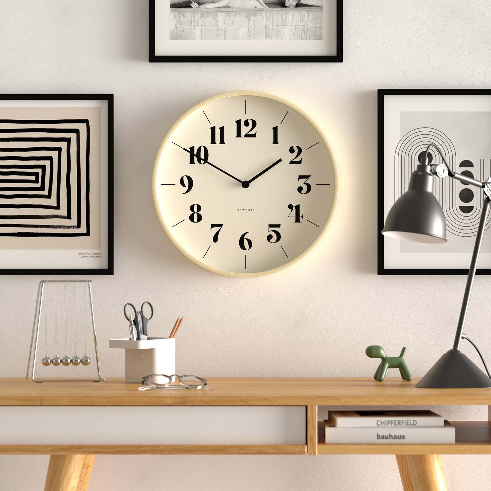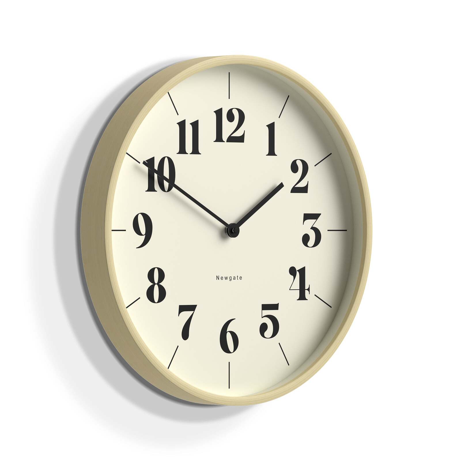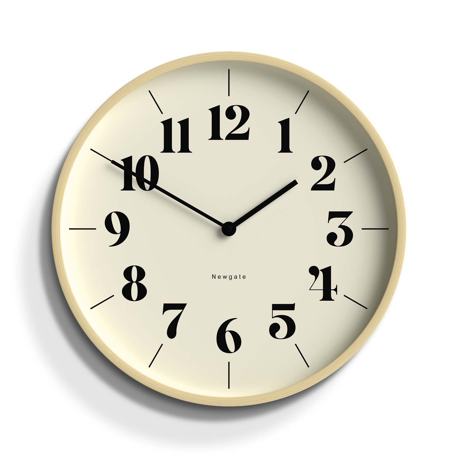 Newgate Mr Clarke Clock Pale Wood Hopscotch Dial A modern wall clock with a pale plywood case and a contemporary theatre dial.