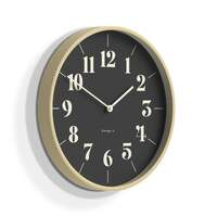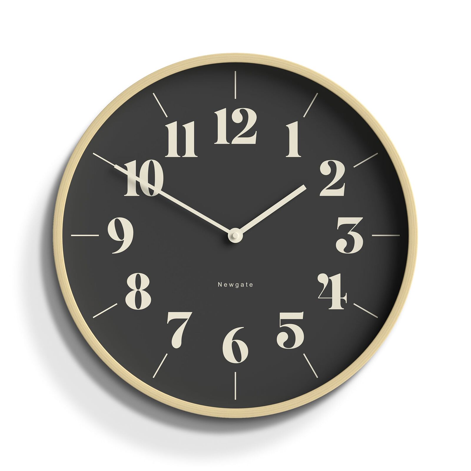 Newgate Mr Clarke Clock Pale Wood Reverse Hopscotch Dial A modern wall clock with a pale plywood case and a contemporary reverse theatre dial.