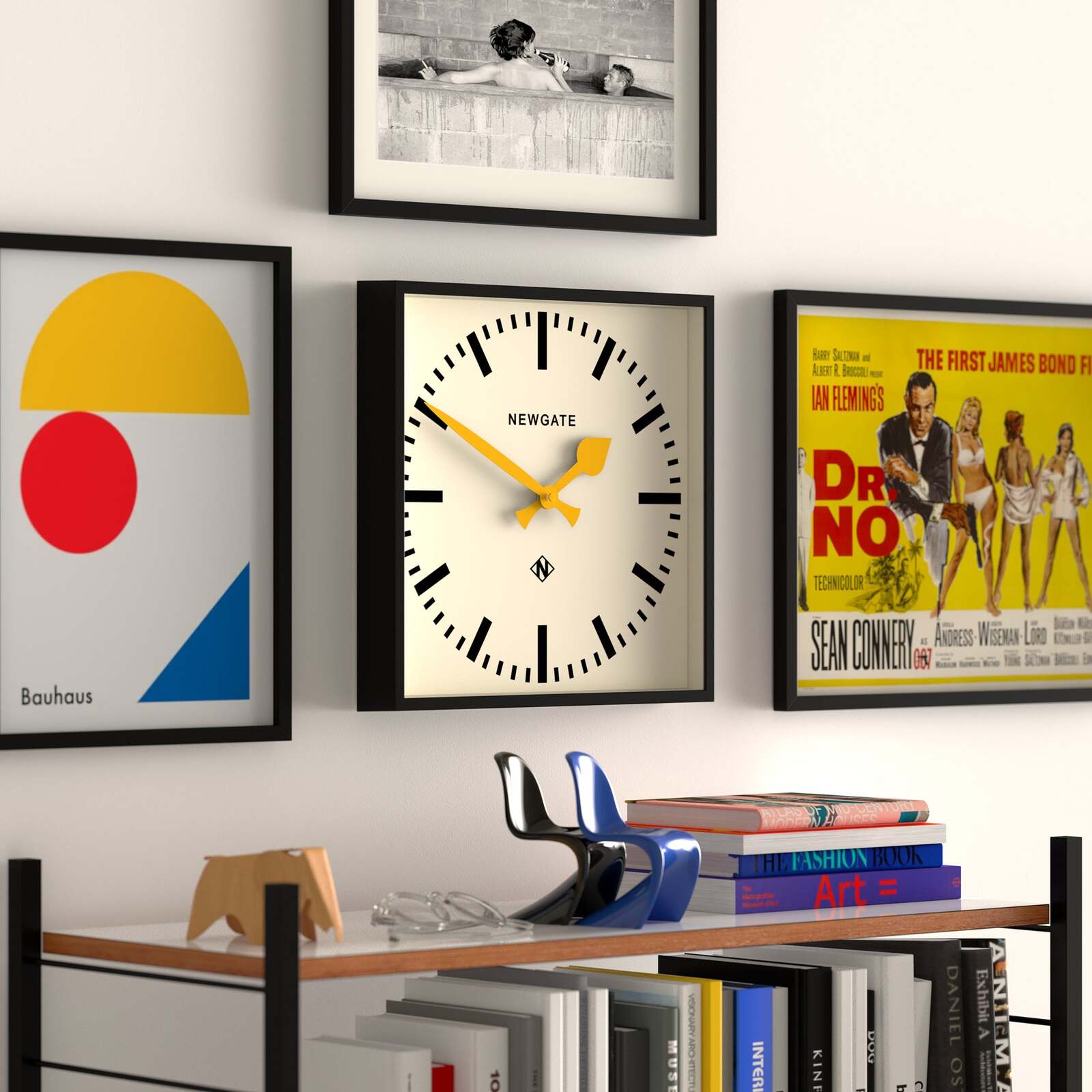 Newgate Number Five Wall Clock Black Yellow Hands A square black station wall clock with a bold marker dial, colourful yellow hands and a minimalist square case.