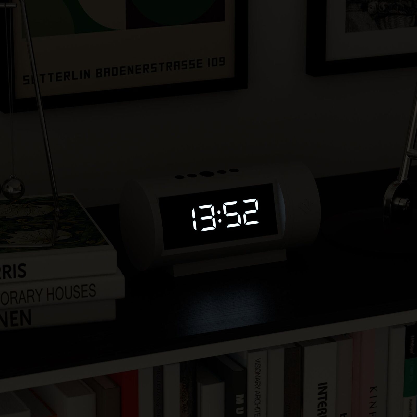 Newgate Pil Led Alarm Clock White A tubular, white retro LED alarm clock with a cut-out black screen that provides the perfect modern bedside or desk accessory.